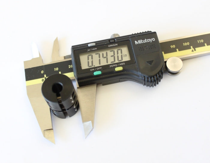 Rigid couplings will keep backlash to a minimum, since the coupling is one single piece. Generally, the motor shaft with a 1/4" diameter will be inserted in one end, and a shaft, or lead screw also measuring 1/4" in diameter will be inserted into the other end. The screws that clamp the shafts will be tightened, but not too much. These types of clamping couplings will not damage the shafts. This coupling is called a clamping coupling or clamp coupling. The length of this rigid coupling is 1.129 inches (28.7 mm). The diameter is 0.743 inches (18.87 mm). The tool needed to tighten the coupling is a hex key or allen wrench (not included) with a size of 3/32 inches. There are four screws in total, two for each shaft that is inserted into this coupling.
