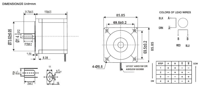 See ProductThis stepping motor has a large frame size and torque and can be used where a great amount of weight is carried and where high load against the motor turning direction is present. A single shaft motor with a diameter of 14mm or .55 inches. There is a keyway on the shaft. The motor rated torque is 1100 oz-in or 8.2 Nm (Newton Meters). This is a very strong motor which will provide enough torque for heavy gantries and high acceleration. Please ask questions here to get any specific information or solutions on wiring and making it work. Wiring: Schema 1: Black to A+, Green to A-, Red to B+ and Blue to B- Schema 2: Red-A+, Green-A-, Yellow-B+, Blue-B- Steps: Standard 200 steps per rotation and can be microsteped using drivers that feature microstepping. The degree per step is 1.8. Size: NEMA 34, or 3.4 x 3.4 inches outer frame (face) dimension or 86mm x 86mm. The length of the motor is 114mm.